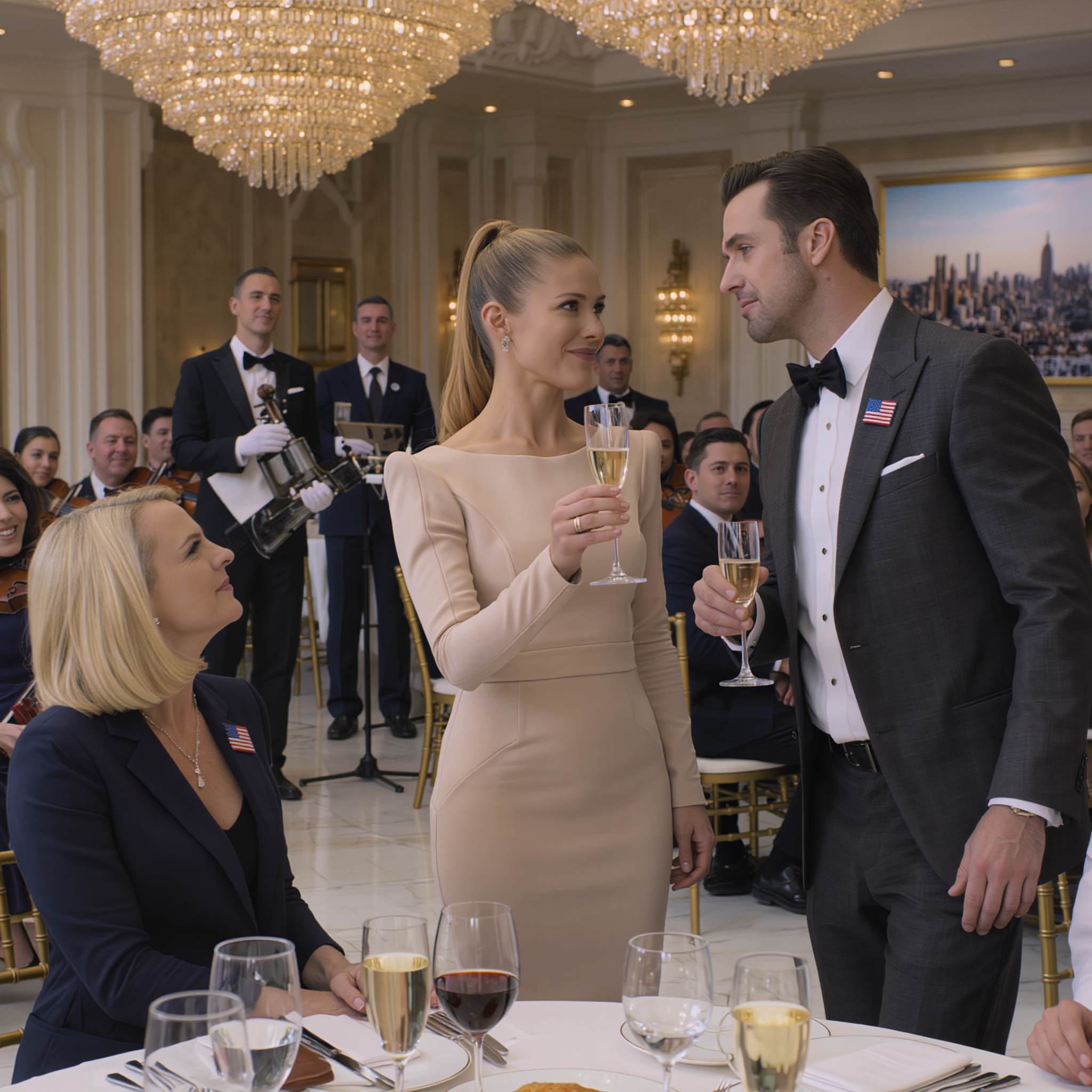 Dinner was served shortly after the toast, and the elegant hum of conversation slowly filled the ballroom again. Crystal glasses clinkedked gently. Silverware tapped softly against porcelain plates. The violin trio shifted into a slower, more romantic melody.